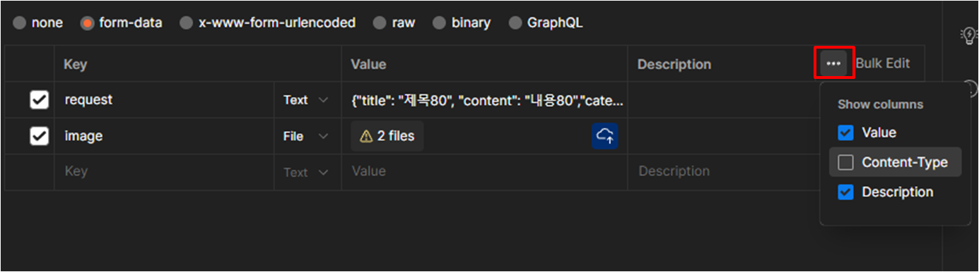 체크를 하면 conent-Type 행이 하나 더 나오게 된다.