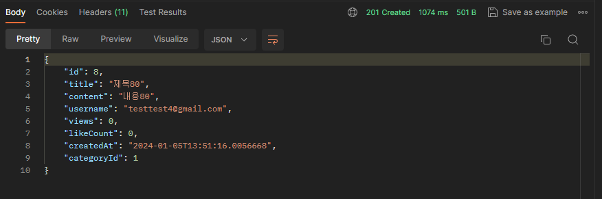 그 후에 실행해보면 제대로 201 created 제대로 실행이 된다.