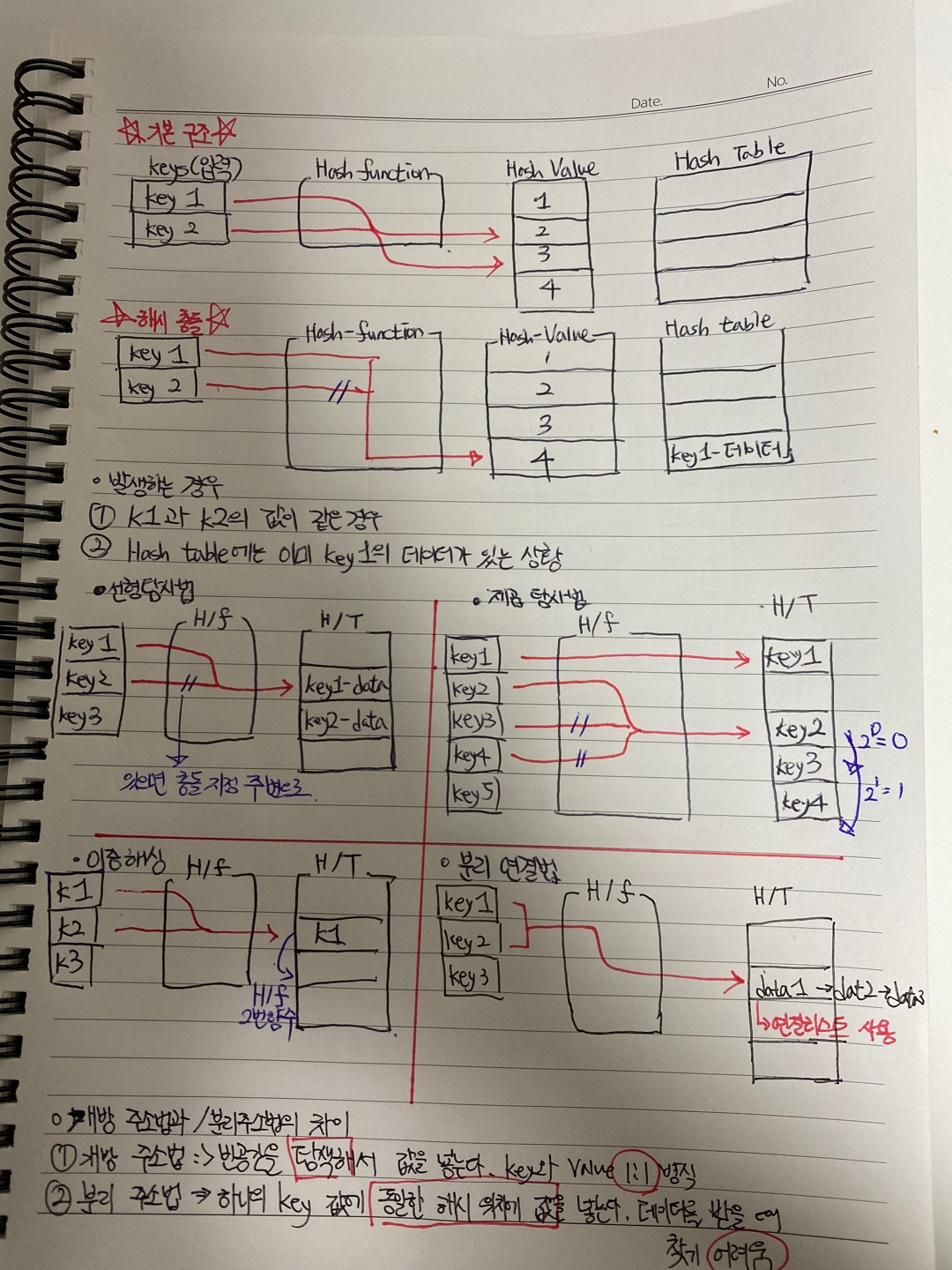 - 비어 있는 공간 탐색 방법에 따라 : 선형 탐사법, 제곱 탐사법, 이중 해싱